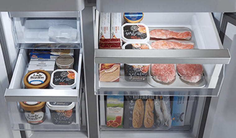 庫内容量は512Lと十分に大きいのですが、同じくらいのサイズのほかの冷蔵庫と比べて、奥行きが薄く設計されているのがポイント。庫内での死角エリアが少ないので、うっかり食べそびれて賞味期限を過ぎてしまうこともなく、食品ロスが減りました。スッキリと置けて、どんな部屋でもなじむ点も魅力だと思います。冷凍庫も中が見やすく整理しやすいので、安心して買い貯めしておけます。