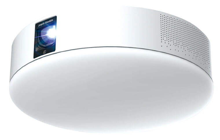 空間の有効活用でヒットした製品の第2弾。「フルHD画質になったほか、壁までの距離が短くても大画面投射が可能に。スピーカー出力も向上し、寝室が上質なエンタメ空間になります!」