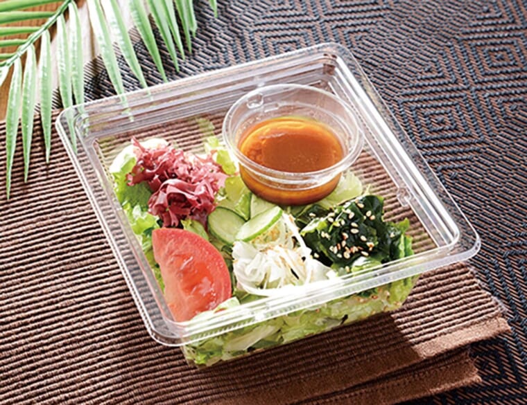 レタスときゅうり、玉ねぎ、トマト、わかめをバランス良く盛り付けた、彩り豊かなサラダ。パリッとしたレタスや歯ごたえのあるわかめなど、食感の違いを楽しみながら食べられる。