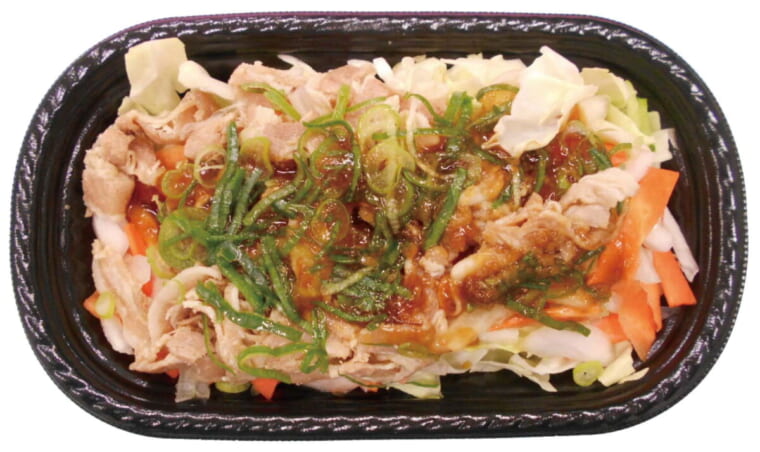 豚肉に、九条ねぎをトッピング。キャベツや玉ねぎもたっぷりで、野菜をしっかりとれる。しょうがの風味が豊かな甘辛のたれが、食欲を刺激する。レンジアップ専用商品。