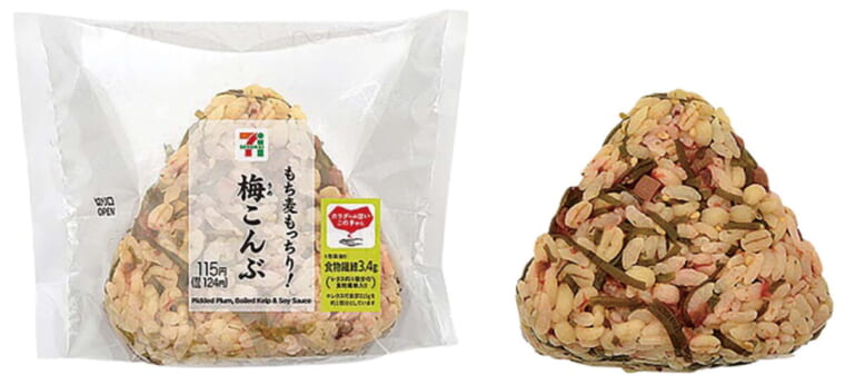 食物繊維が豊富なもち麦を使ったおむすび。この1個でレタス1個ぶんの食物繊維を摂取できる。昆布と赤しそに加えて、カリッとした梅チップが混ぜ込まれ、食感の違いを楽しめる。