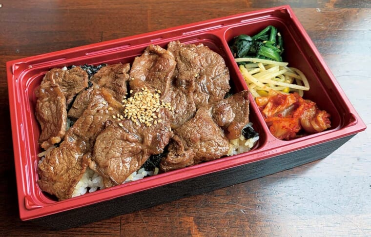噛むごとに肉の旨みを楽しめる部位のミスジを使った弁当。ごまの風味が肉の香りを引き立てる。安楽亭秘伝のタレをつけて焼いた肉は、時間が経っても柔らかいのが◎。