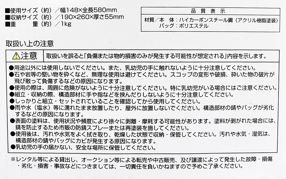 「スコップにしては華奢すぎるかも……」と少し不安だったのですが、本体の素材にハイカーボンスチール鋼が使われているおかげで強度は抜群。スコップの大きさは約148(幅)×580mm(全長)くらいと扱いやすく、女性や子どもでも気軽に利用できますよ。