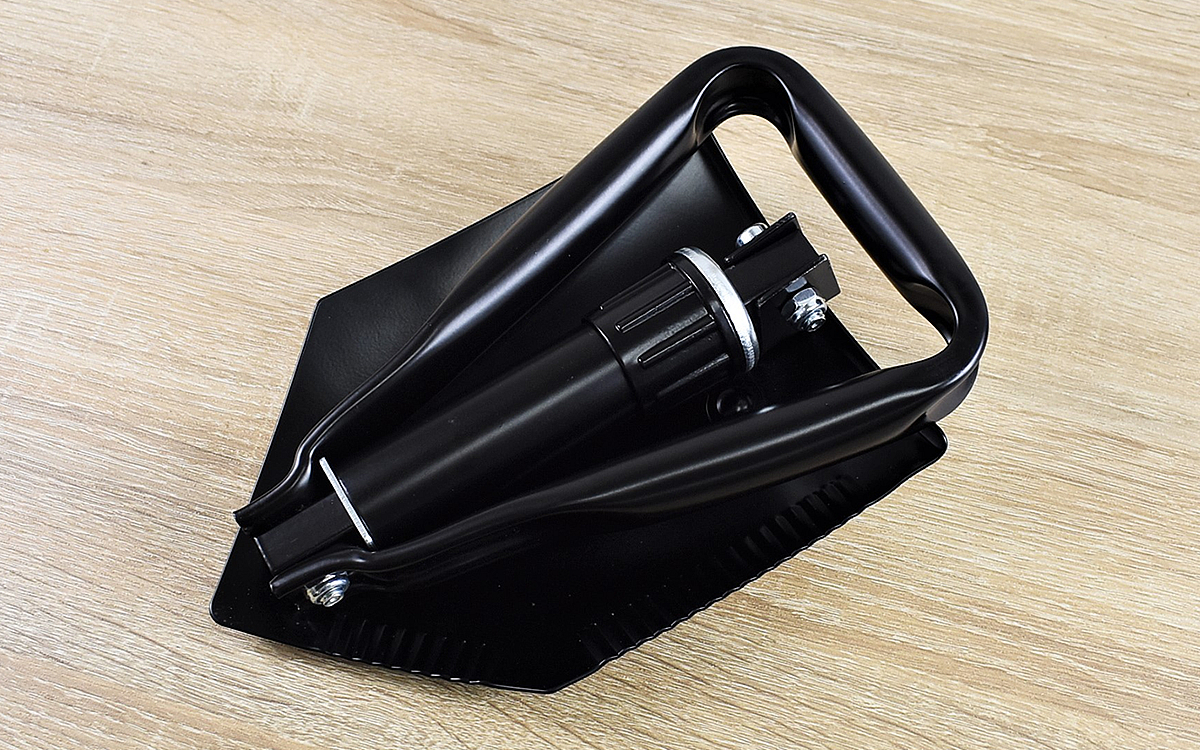 それではさっそくスコップに変形させてみましょう。まずは折りたたまれた柄の部分を広げて本体のパーツを展開。後はスコップの根本にある固定リングで稼働部分をロックすれば完成です。