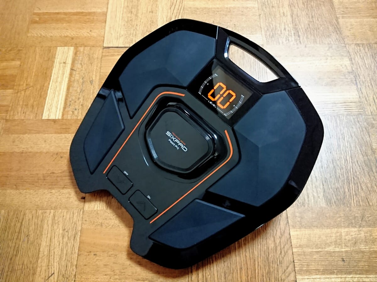 腹筋を鍛えるAbs Beltと同時に試したのがFoot Fit。この製品の見た目は体重計のようですが、スイッチを入れて足を乗せるだけでステップ部分から低周波が流れて足の筋肉を刺激するというものです。操作は至って簡単。まずは裏側のステップ部分を引き出し床に置きます。