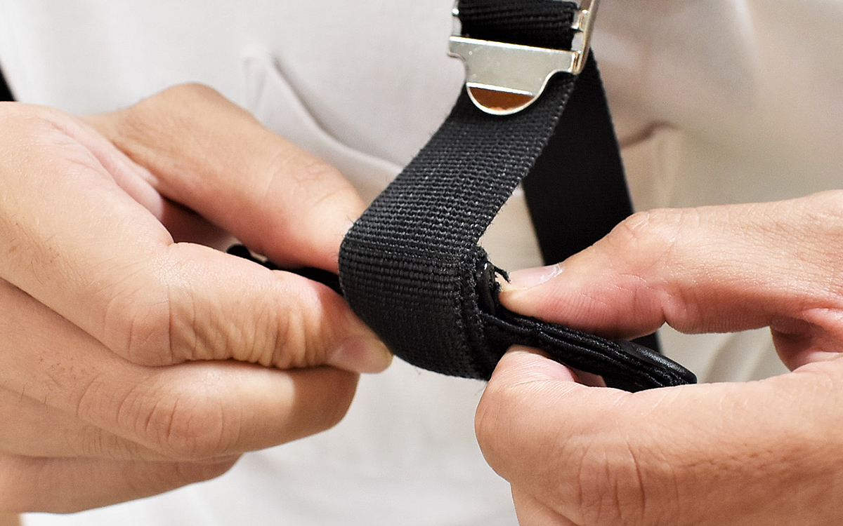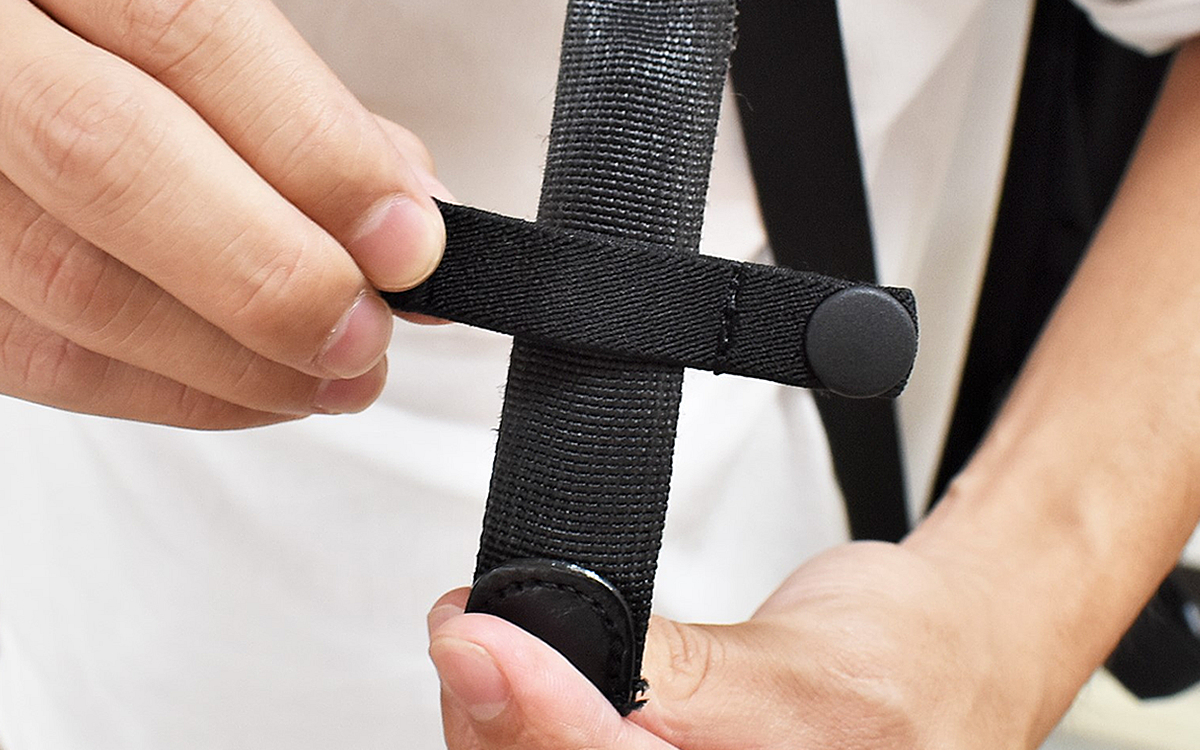 まずはバンドの中央に余ったベルトを通し、端の部分にセット。そこからベルトの根本へ向かって、バンドごと巻き上げていきます。丁度いいところまで巻いたら、ホックを留めて肩紐を固定。余分な肩紐を小さく束ねることができました。