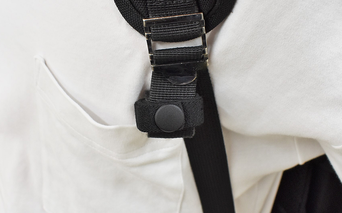 約3cmまでのベルトに対応しており、2つセットなので両方の肩紐に取り付けることが可能。さっそく手持ちのリュックを使い、使い方を確かめていきましょう。