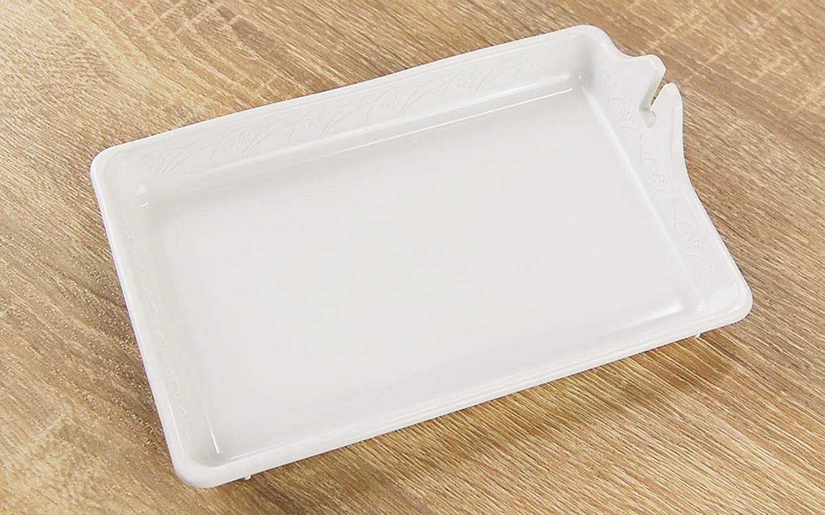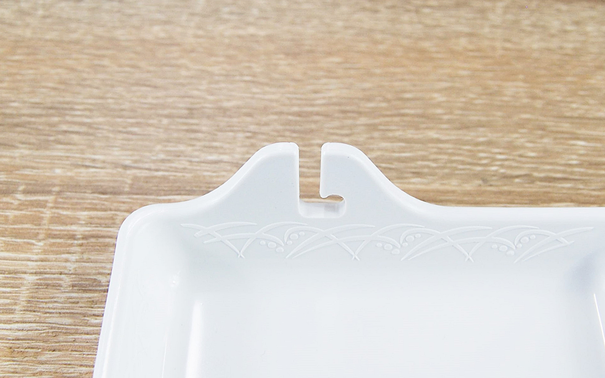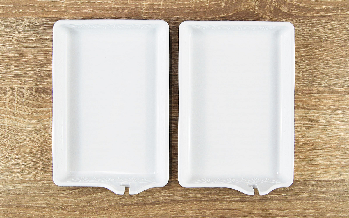 約16.5(幅)×11.3(奥行き)×3.3cm(高さ)ほどのトレーが2枚セットになった同商品。本体には耐熱性の高い「PBT」と呼ばれる素材が採用されており、電子レンジの加熱にも対応しています。トレーのフチについた“L字型”の溝を使い、串料理の具材を簡単に取り外せるのが最大のポイント。それではさっそく使い勝手を確認してみましょう。