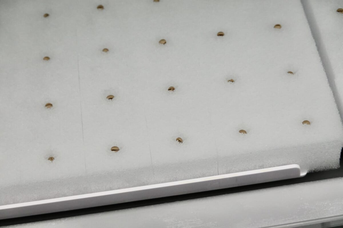 では、植物の成長過程にのっとって工場内を見ていこう。最初に訪れたのは「育苗室(いくびょうしつ)」と呼ばれる、種から発芽させ苗床で苗を育てる部屋。専用のベッドに一粒ずつ種を植え、4時間に1度の間隔で散水すると、2日間程度で発芽する。