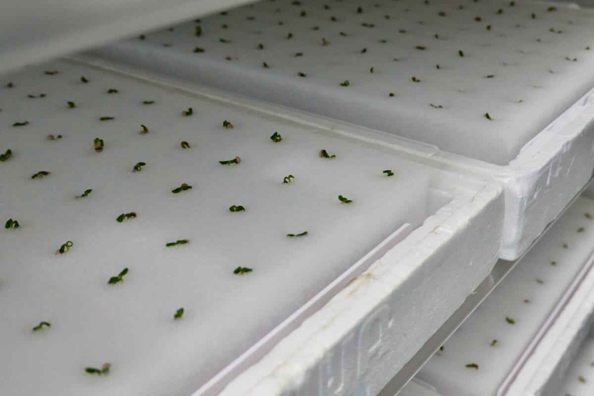発芽するとベッドごと、栄養分が加えられた水“養液”で満たされたプールに移される。