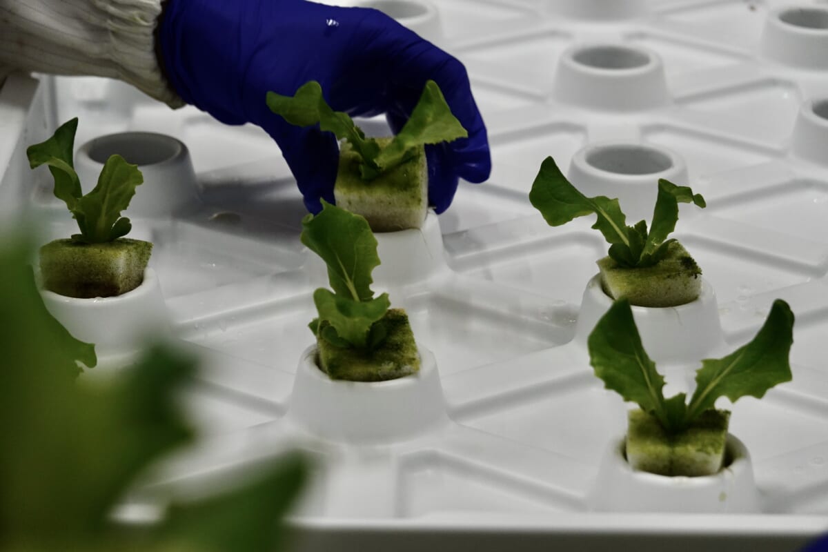 育苗室で発芽して一定の大きさまで育った苗は、次の「栽培室」へと移される。その際、苗は発育をチェックされた上で、ひとつひとつパレットに移植される。