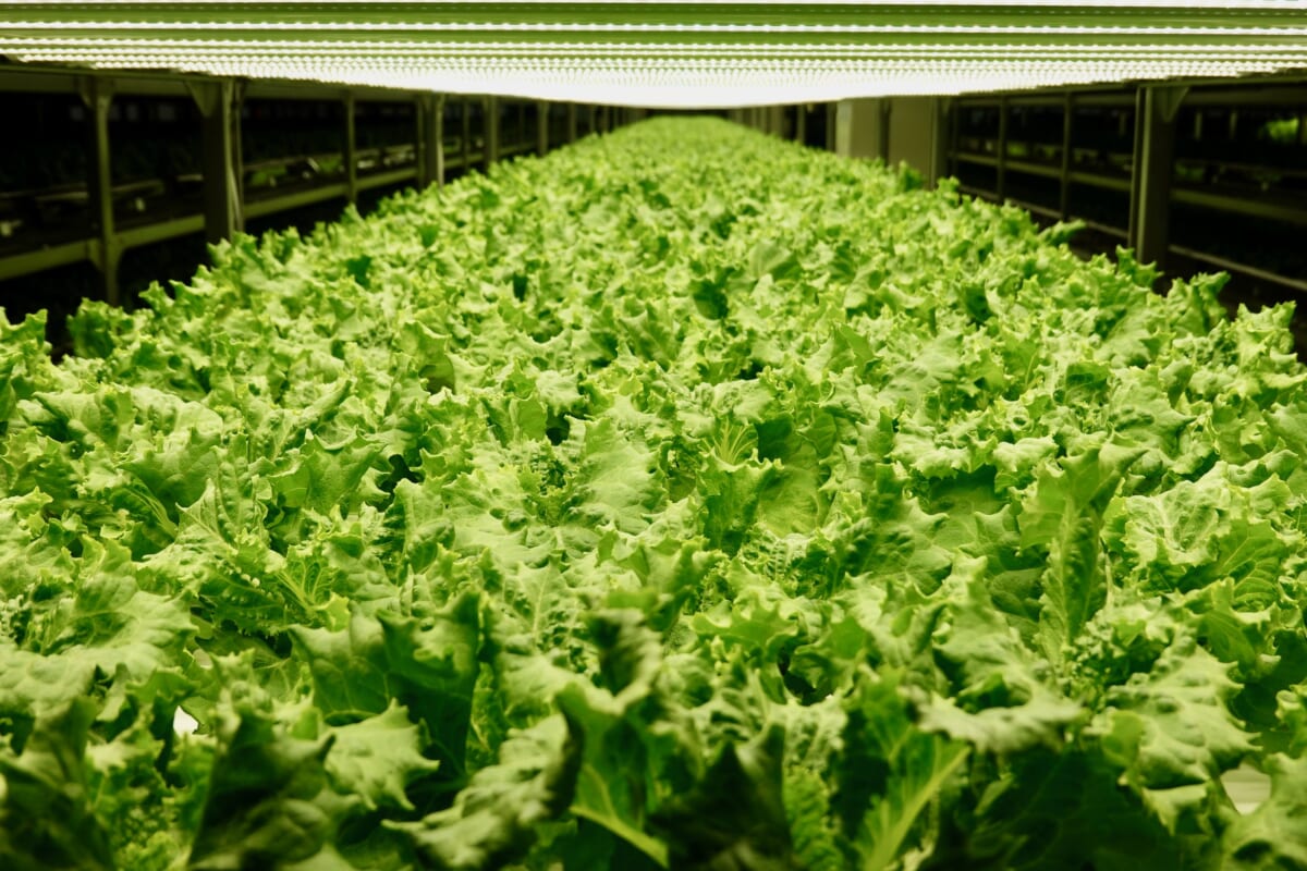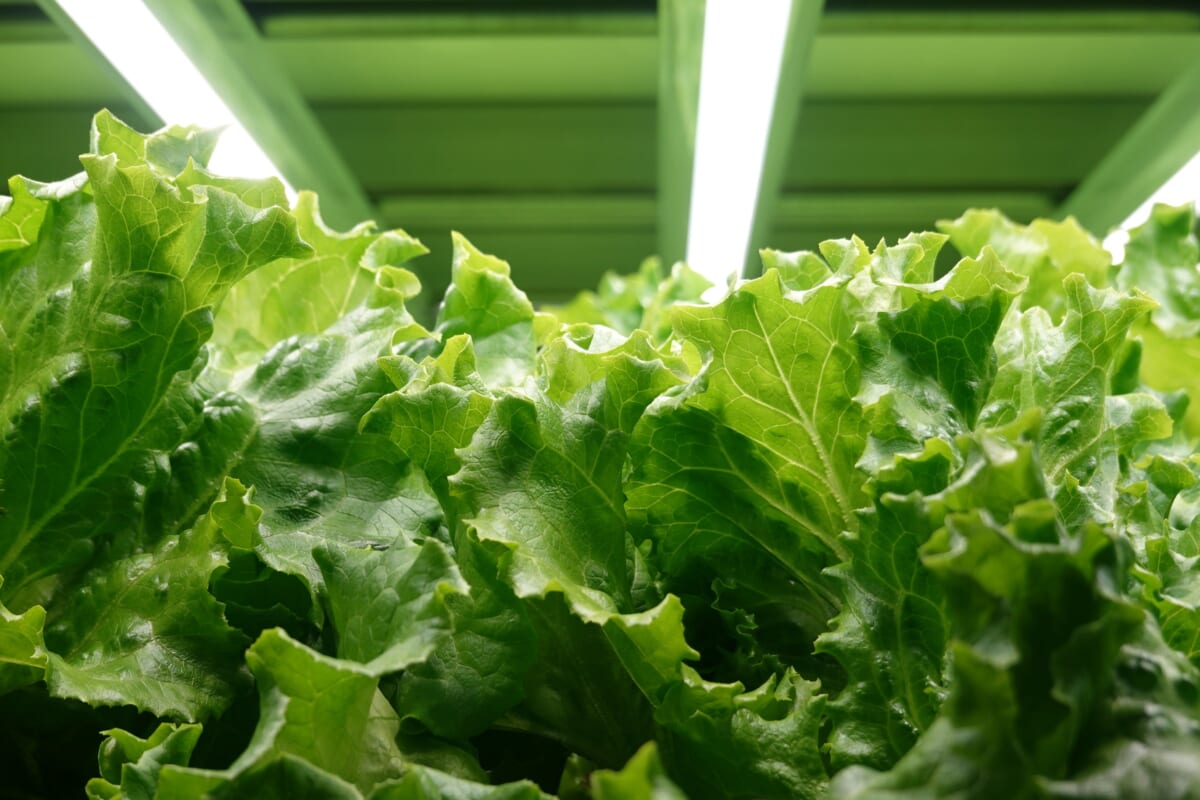 光にあふれる衛生的な空間で青々と野菜が茂る
