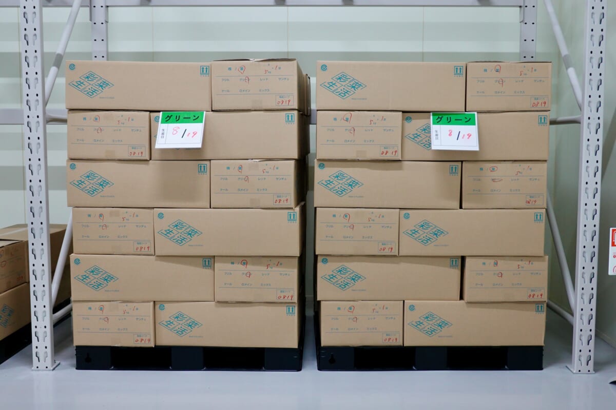 彩菜生活のロゴ入り段ボールに詰められたリーフレタスは、出荷まで冷蔵庫で過ごす。