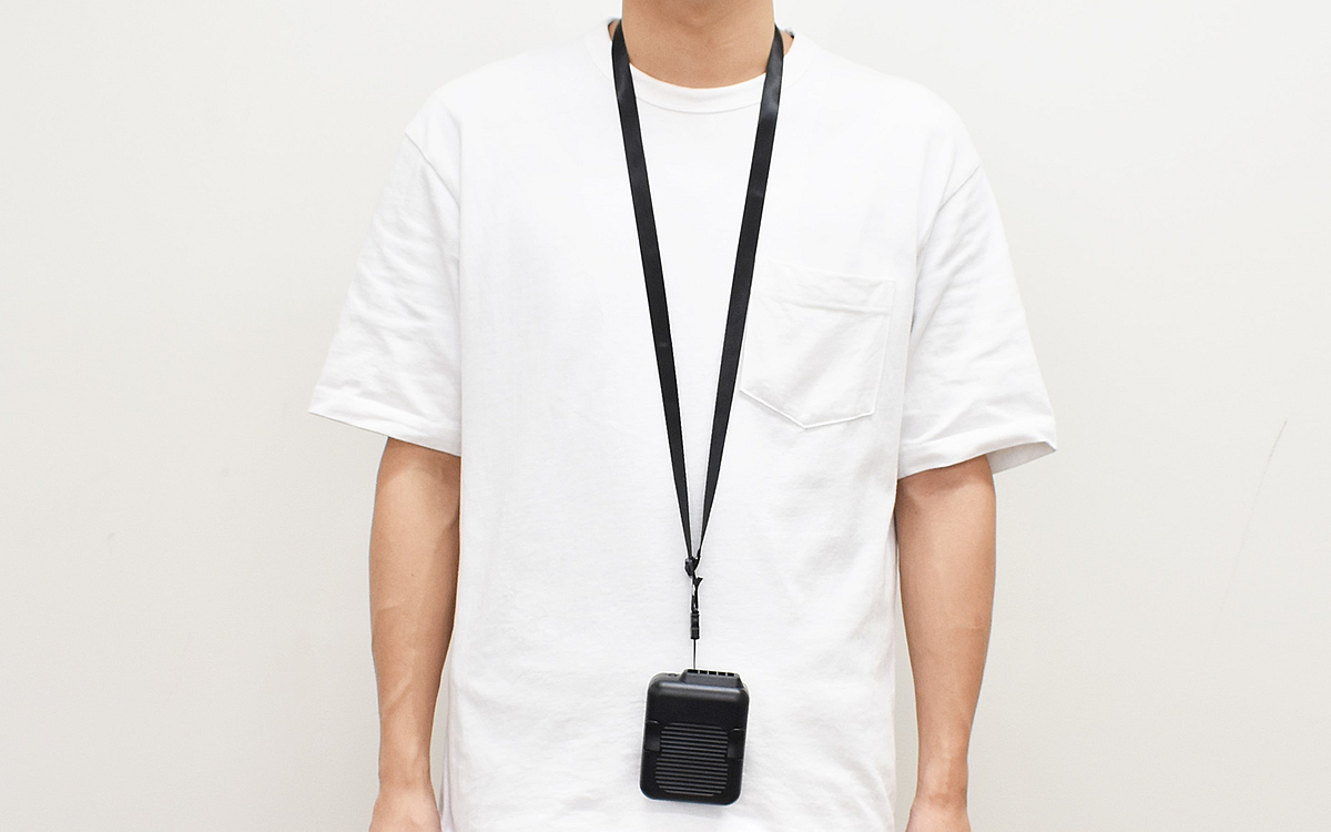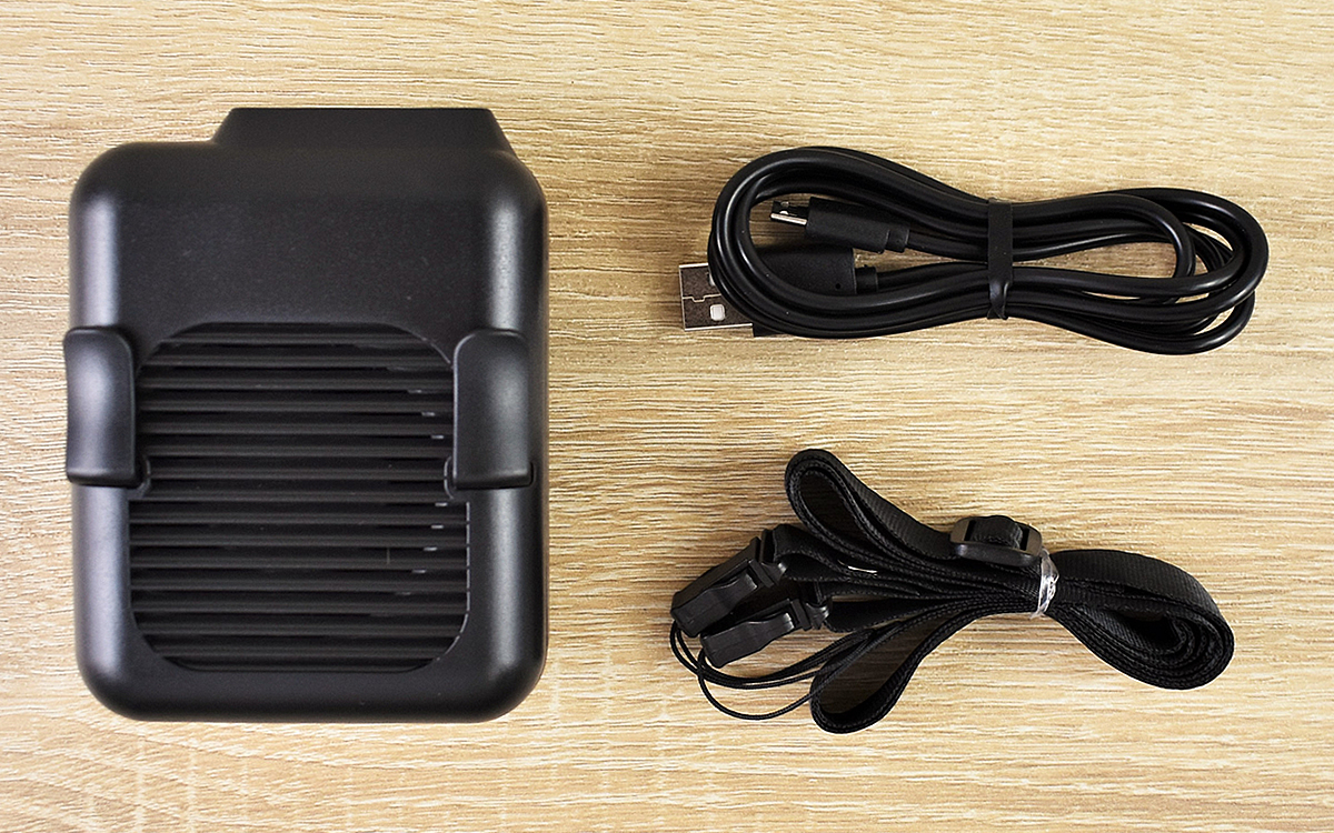 同商品は読んで字の如く、ベルトに装着しても使える小型扇風機。大きさは約75(幅)×45(奥行)×100mm(高さ)ほどで、重量はおよそ168gです。パッケージの中に入っているのは本体とmicroUSBケーブル、ネックストラップ、説明書のみ。ベルトに装着できるだけでなく、ストラップを使えば首にも掛けられる“2way仕様”になっています。