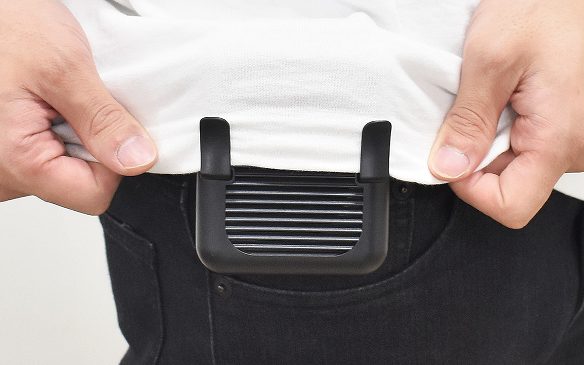 それでは、ベルトに取りつけて実力をチェックしていきましょう。さっそく電源をオンにしてみると、Tシャツの中に涼しい風がフワリ……。かなりコンパクトなサイズ感ですが、思っていた以上に風量はパワフルでした。