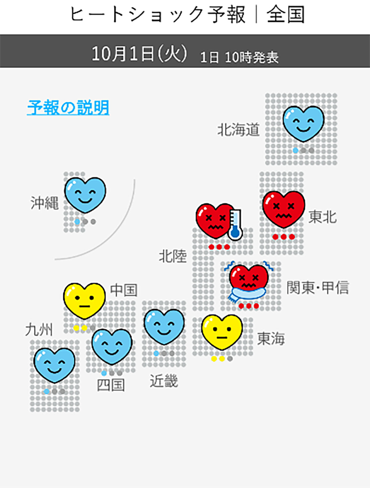 ーー他方、「STOP!ヒートショック」のほかにも「ヒートショック予報」というものもあります。全国各地、各日の天候、気温などによってヒートショックになりやすいかどうかを、5段階に測って表示されていますが、どういった根拠で算出されたデータなのでしょうか?