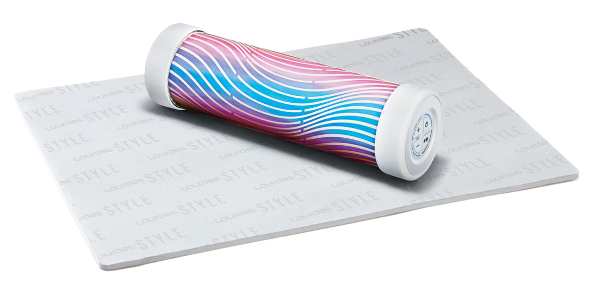 最後は業界初※、ストレッチ用ロールにEMSと振動の2つの機能を搭載した、全身をくまなくストレッチ&エクササイズできる「ルルドスタイル EMSパワーロール」です。フィットネス用品として知られるストレッチ用ロールに、ダイレクトに筋肉へアプローチするEMSを搭載しています。EMSが表層の筋肉を刺激しながら、強力な振動でアプローチし、より高いストレッチ効果を実現。自宅セルフコンディショニングのアイテムとして、見た目も良いオーロラカラーのデザイン。いつでも手軽に使えるよう、防振保護用のデザインマットと通電性を高めるアトマイザーも付属しているという至れり尽せりのセットです。