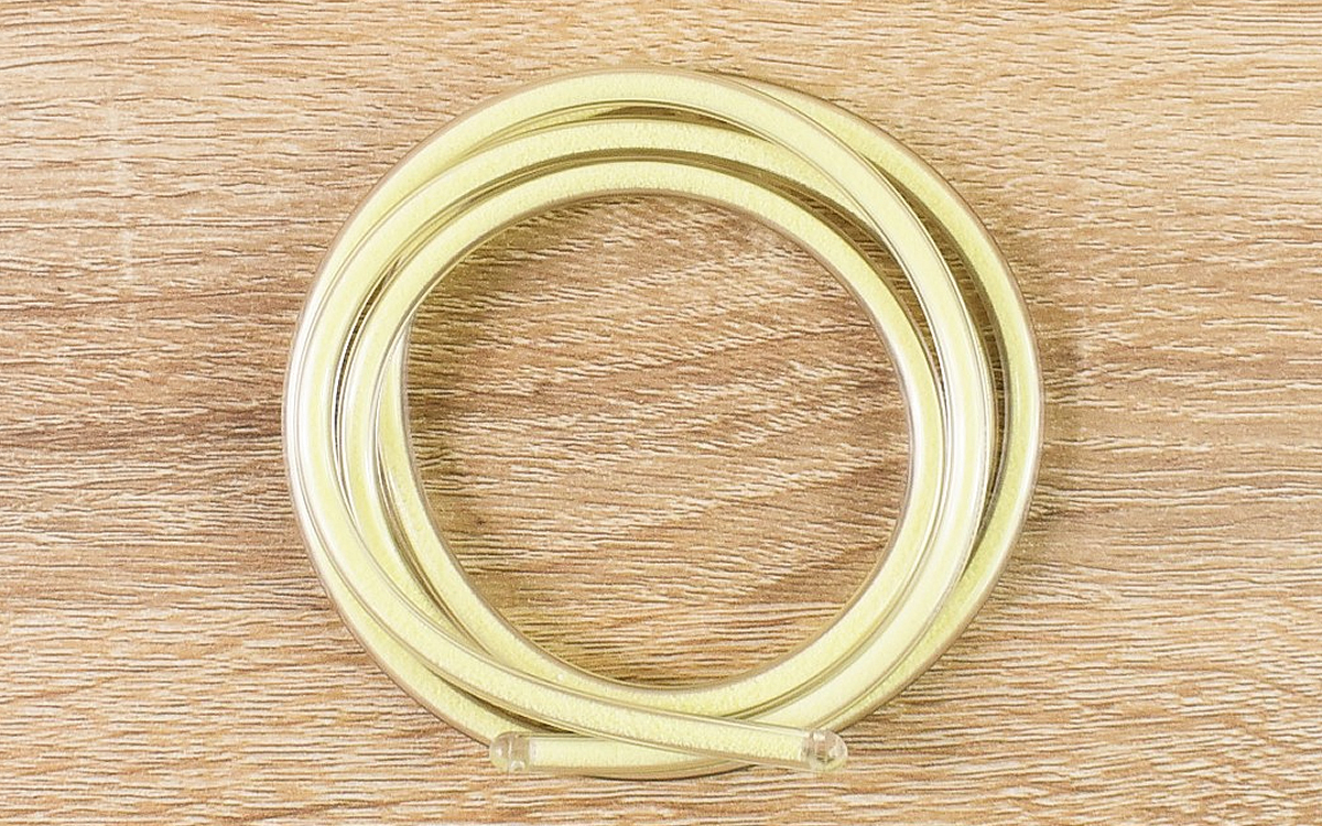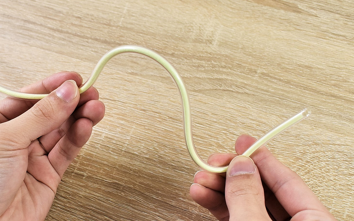 約100(長さ)×0.5cm(直径)ほどの塩ビ系エラストマー製チューブに、黄色い蓄光顔料の粒子が入っている同商品。チューブはとてもやわらかく、折り曲げても結んでも問題なく使えます。