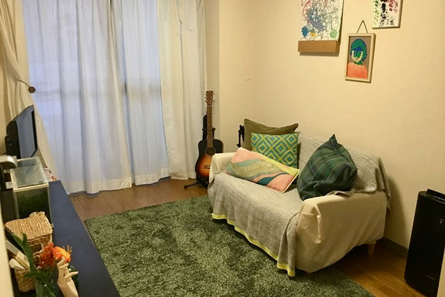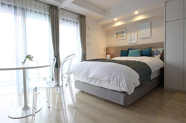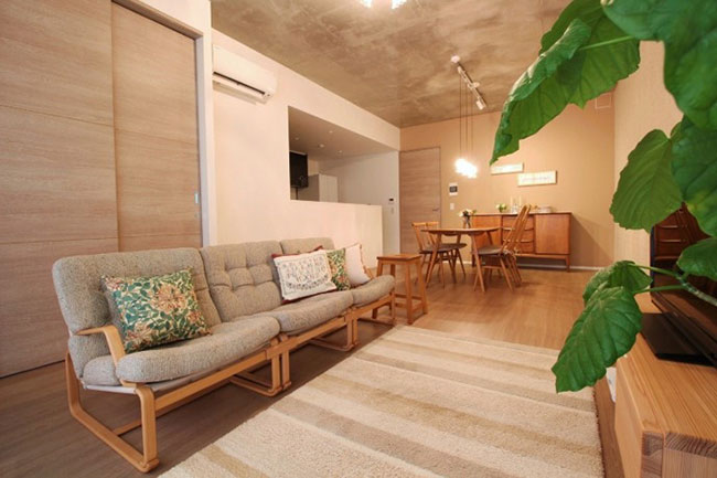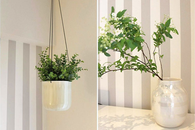 こちらのお部屋は荒井さんがコーディネートした部屋。入口の対角がすっきりしすぎていて寂しげだったので、写真の左奥、入口の対角にくる部分に、ハンギングとポットタイプのフェイクグリーンを取り入れたそうです。
