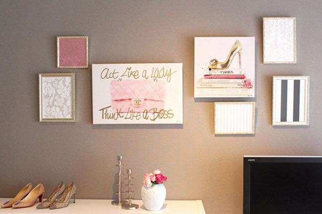 「こちらのお宅ではグリーンをあまり好まれなかったので、他のもので見せ場を作ることにしました。2枚の絵は新しく買ったものですが、その周囲にあるものはサンプルでもらった壁紙や包装紙を額に入れたものなんです。また、ファッションが好きな方だったので、まだ履いていない靴もスタイリングしています。こんなふうに好きなものを飾ると、テンションも上がりますし、その方のお人柄を感じられていいですよね」