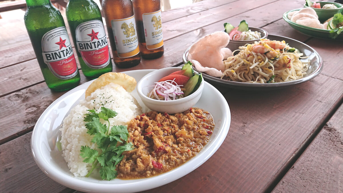 ↑自慢のシーフードバーベキューは一人前3000円から。ボリュームのある海鮮BBQに舌包みを打ち、アジアンビール(650円)やオリジナルカクテル(650円)、トロピカルドリンク(600円)で喉を潤すのがおすすめ。キーマカリー(1300円)、パッタイプレート(1200円)、ナシゴレンプレート(1400円)、カオマンガイプレート(1400円)など、アジアンメニューも充実している