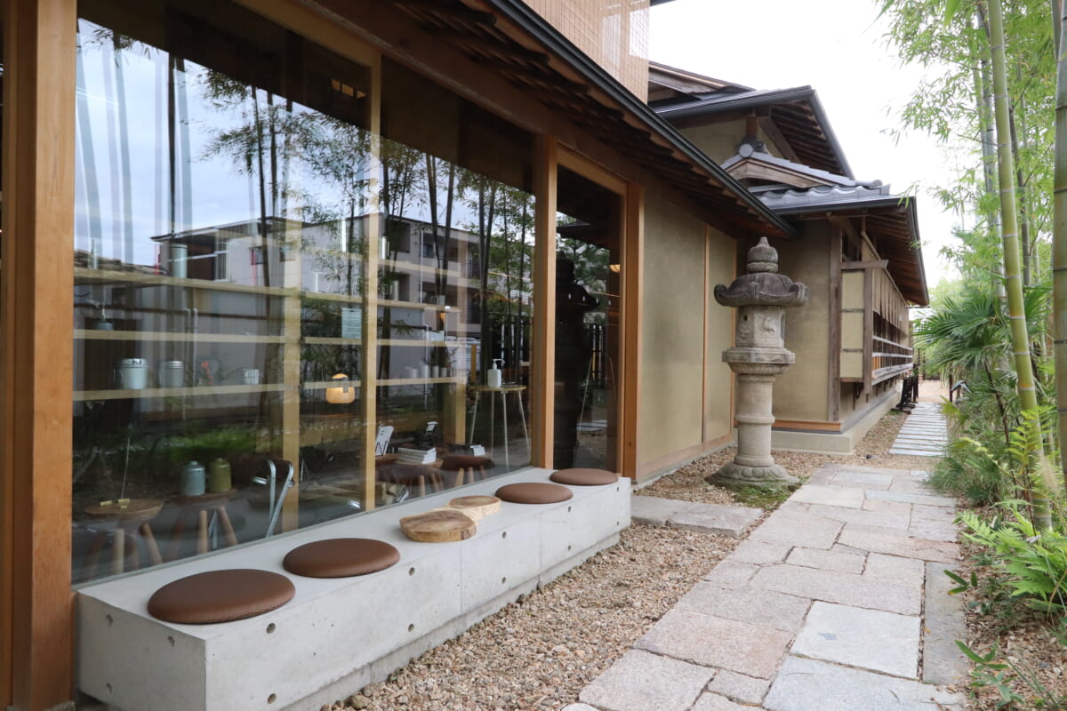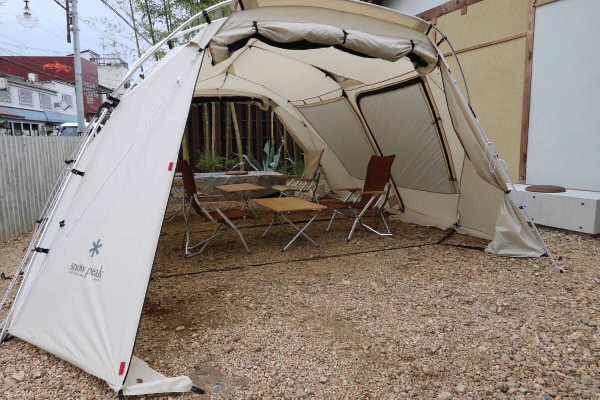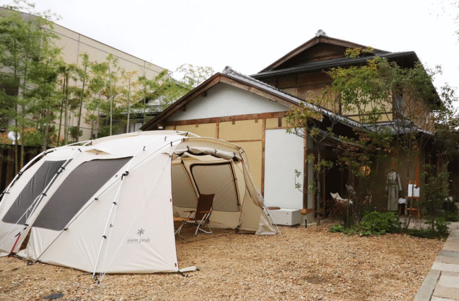寺社仏閣が点在し、風光明媚な古都・京都を感じる嵐山にアウトドアブランドのスノーピークがどう立ち向かうのか楽しみに向かうと、竹林に囲まれた伝統建築に寄り添うように設置されたアイボリーのテントが突如目の前に。京都の伝統とアウトドアブランドが見事に融合し、スタイリッシュな中にもどこかアットホームな外観にお見事の一言!