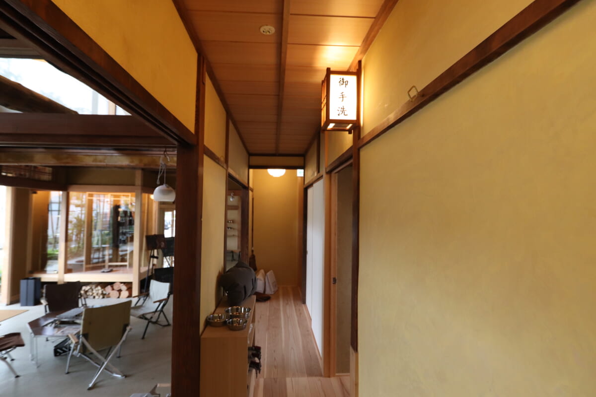 実はこの建物、大正時代に建てられた料理旅館をリノベーションしたもの。柱や梁、左官壁など、今に受け継がれた伝統建築を活かしつつ、スノーピークのスタイリッシュなテーブルやイスをうまく配置した空間は、伝統と革新のバランスが見事に調和し、感覚的な心地よさを感じられます。