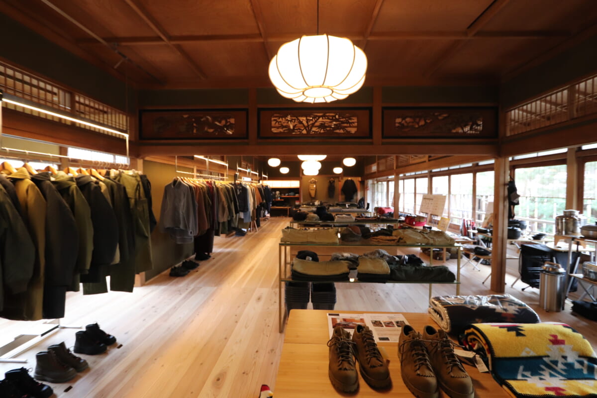 アパレルやキャンプギアを配置したショップスペースは、履物を脱いであがるスタイル。大正時代から使われている落ち着いた色合いのライトや木のぬくもりを直に感じるフロアは居心地よすぎて長居必須!