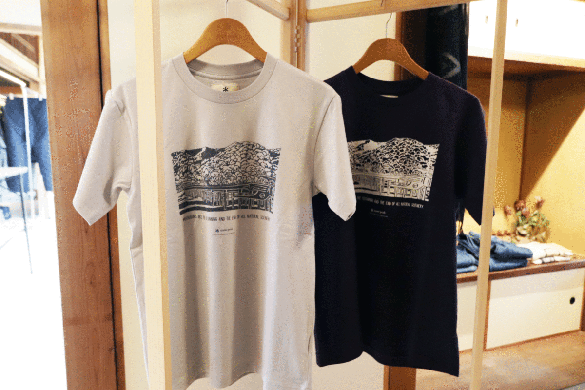 スノーピークファンなら見逃せない嵐山限定グッズも販売。一押しはオリジナルTシャツ。嵐山の観光名所、渡月橋がプリントされているだけかと思いきや、橋の土台は木ではなく、固い棒のようなものが…。実はテントやタープを固定するスノーピークオリジナルの「ソリッドステーク」で作られた渡月橋がプリントされているんです。渡月橋をソリッドステークで作ったら…これぞまさに新旧融合Tシャツ!