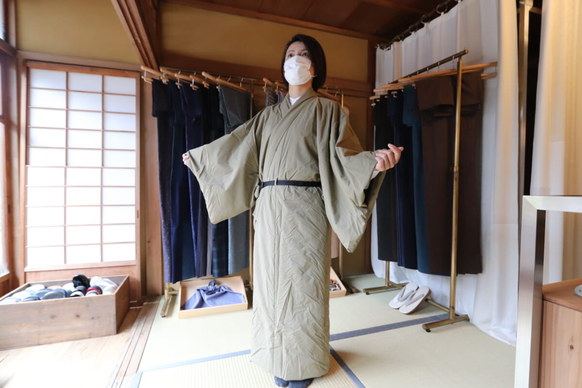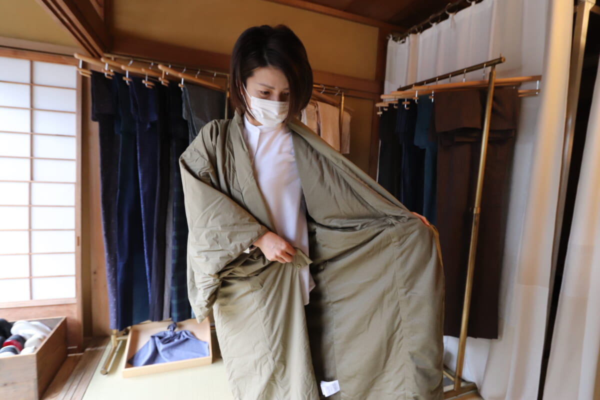 羽織ってみると、着ているのか忘れるほどの軽さで保温性も抜群! そでの部分もちょうどいい幅広さで、そのままロングコートとしても活躍してくれそうなデザインです。さらに着物として着るときの着方がシンプル! 着物の中と外にあるボタンを2か所止めます。