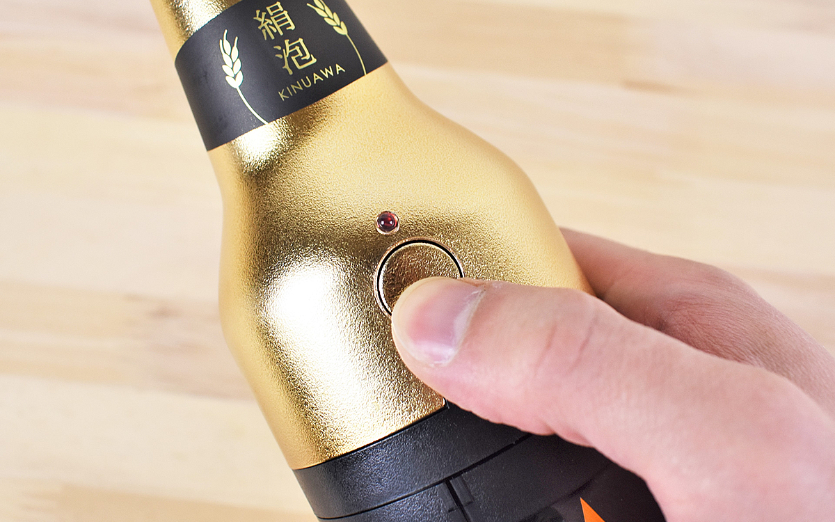 使い方もいたって簡単。まず冷やしておいた缶ビールを開け、本体を取りつけます。次にグラス7分目までビールを丁寧に注ぎ、電源スイッチをオン。あとは残りのビールを入れたら、クリーミーな泡たっぷりのビールが完成です。公式サイトによると、毎分4万回の振動を起こすW超音波のおかげできめ細かい泡が生まれるとか。私も注ぎたてのビールを味わってみたところ、確かに濃密な泡を体感できました。