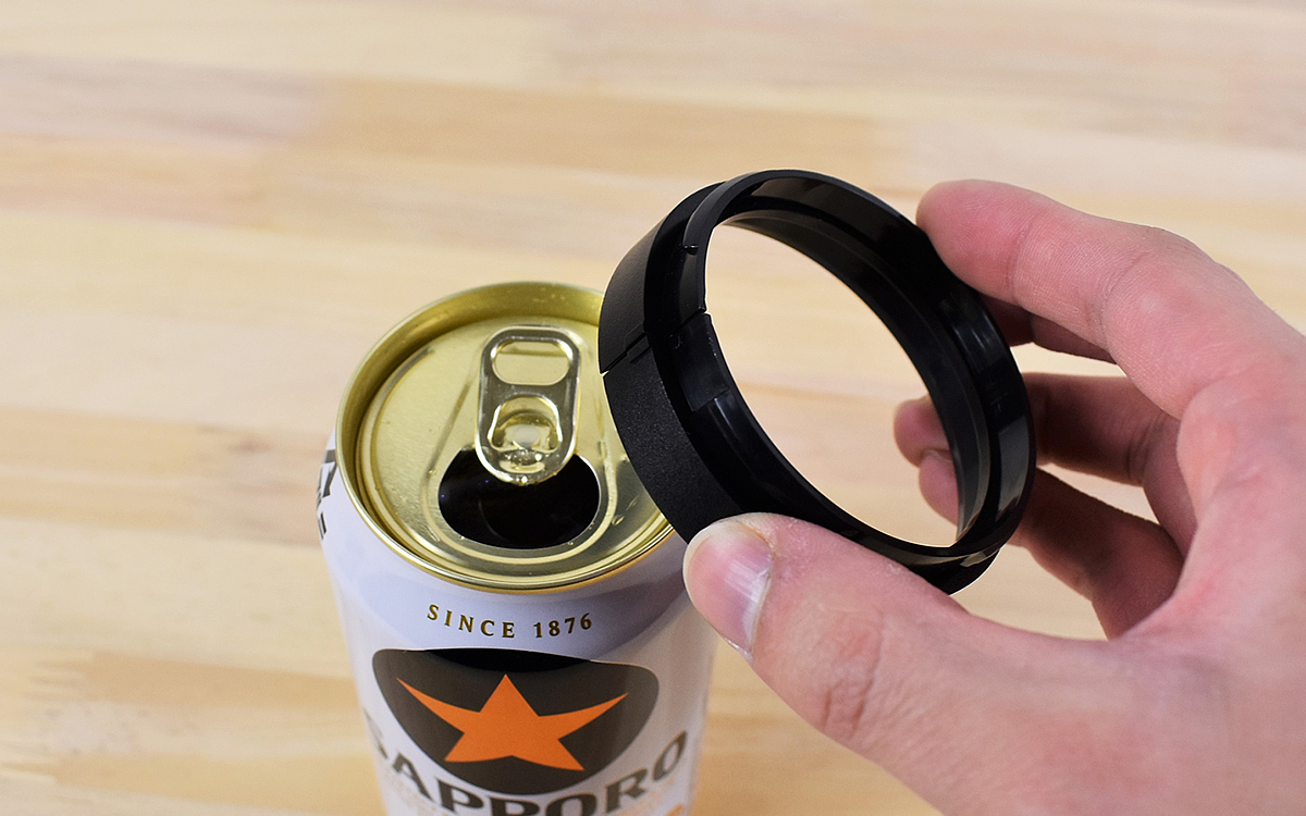 およそ68(幅)×68(奥行き)×142mm(高さ)ほどの同商品。金色の美しいフォルムが目を惹きます。さっそく缶上部に取りつけてみると、飲み口が瓶ビールのような見た目に早変わり。しかもどの缶にも対応できるというから驚きです。外に瓶を持ち出すのはなんとなく気が引けてしまいますが、このビアサーバーさえあれば気軽に瓶ビール気分を楽しめますよ。