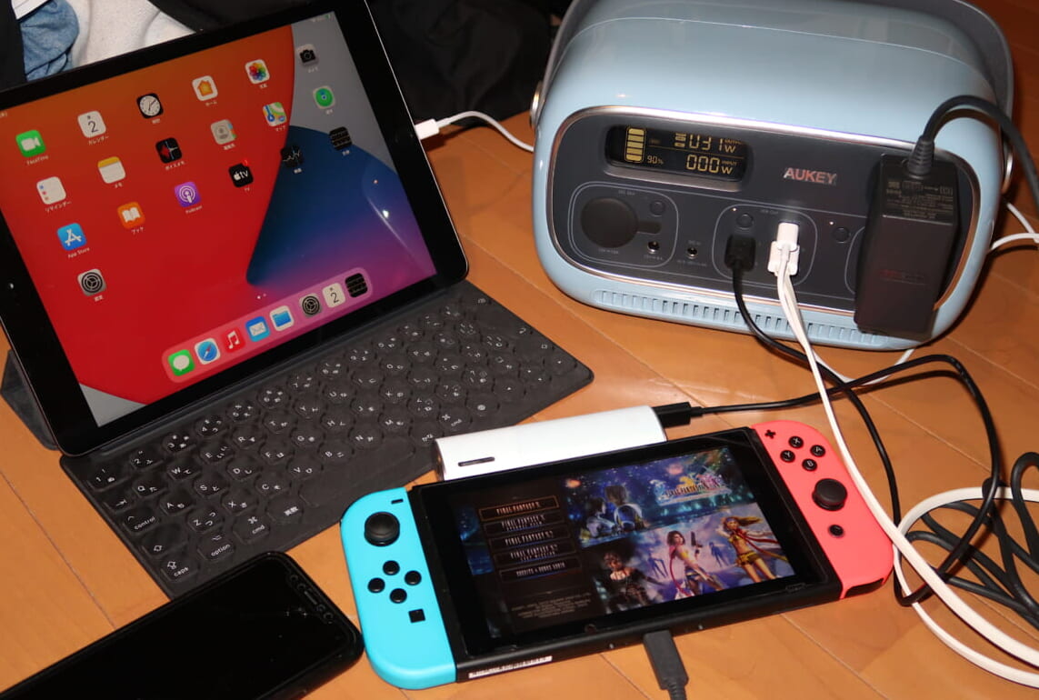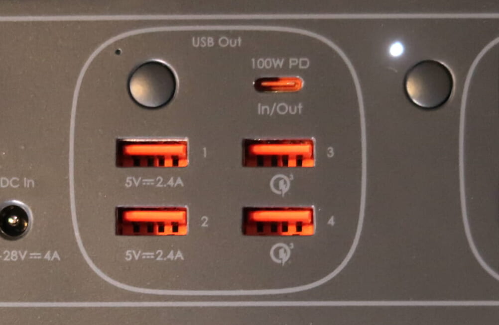 出力はDCポートが1つ、ACが2つ、USB-Aポートが2つ、急速充電USB-Aポートが2つ、USB-Cポートが1つ、シガーソケットが1つ。USBポートが搭載されているので、スマホやタブレットの充電が可能。AC・DC出力ポートからでもコンセント式充電器は使用できますが、USBポートがあればより便利。とにもかくにも計9つのデバイスへ同時に給電が可能なので、家族で使う場合もこれ1つでほぼすべてがまかなえてしまいます。