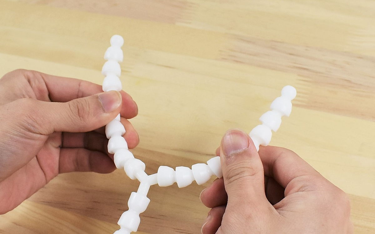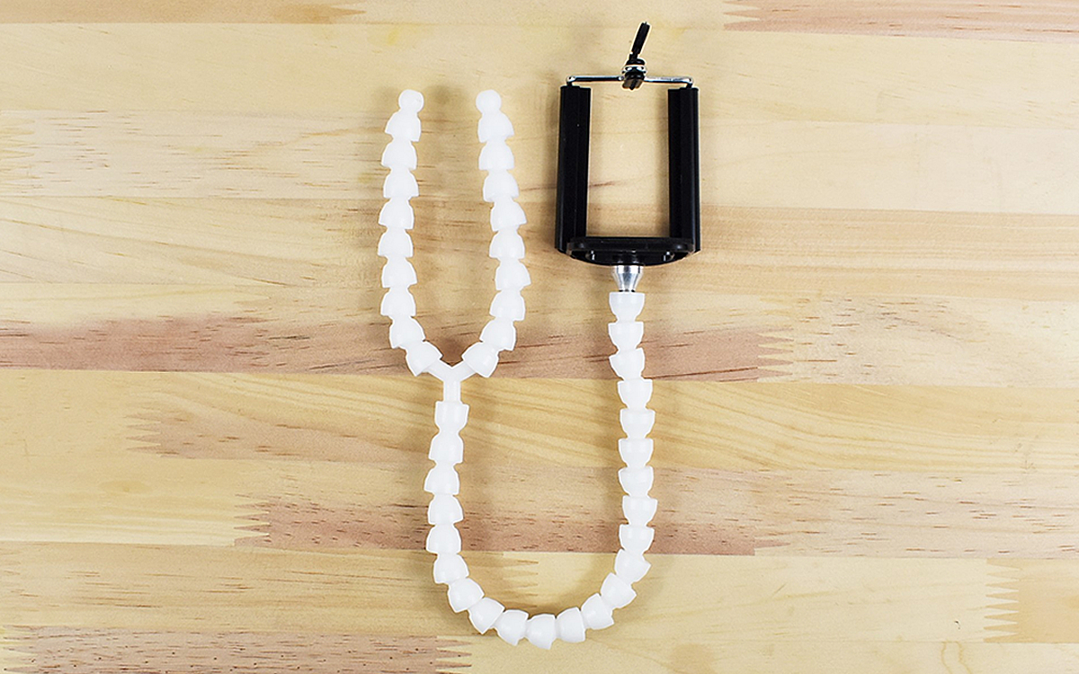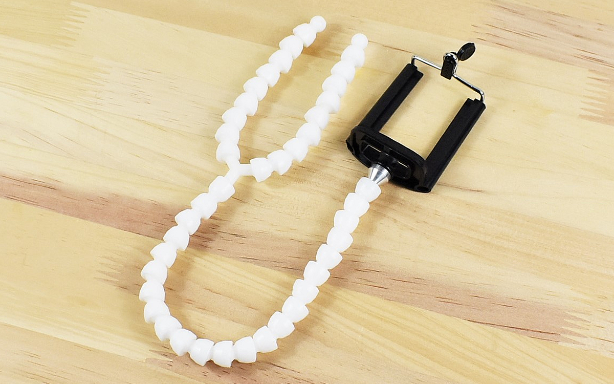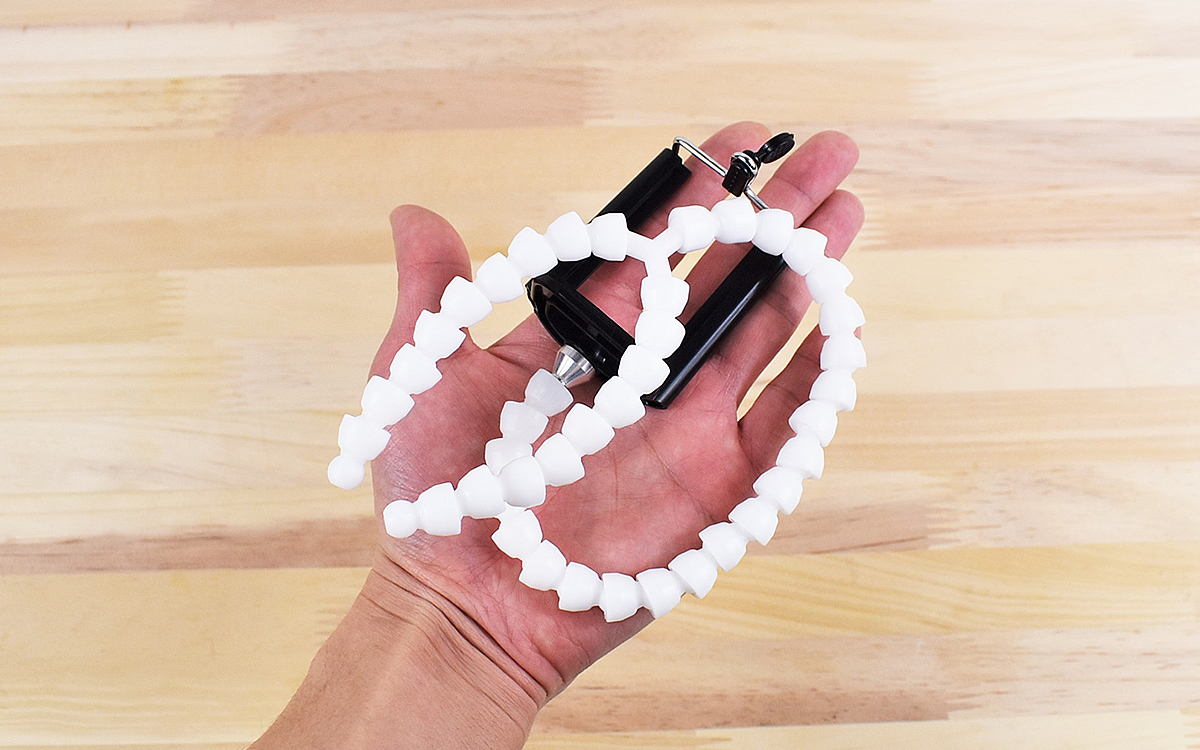 ぬいぐるみを固定する白いアームと、スマホを取りつけるパーツが一体となった同商品。およそ25cmのアームは自在に曲げられるので、ぬいぐるみをスマホ画面内の写したい場所に調整できます。