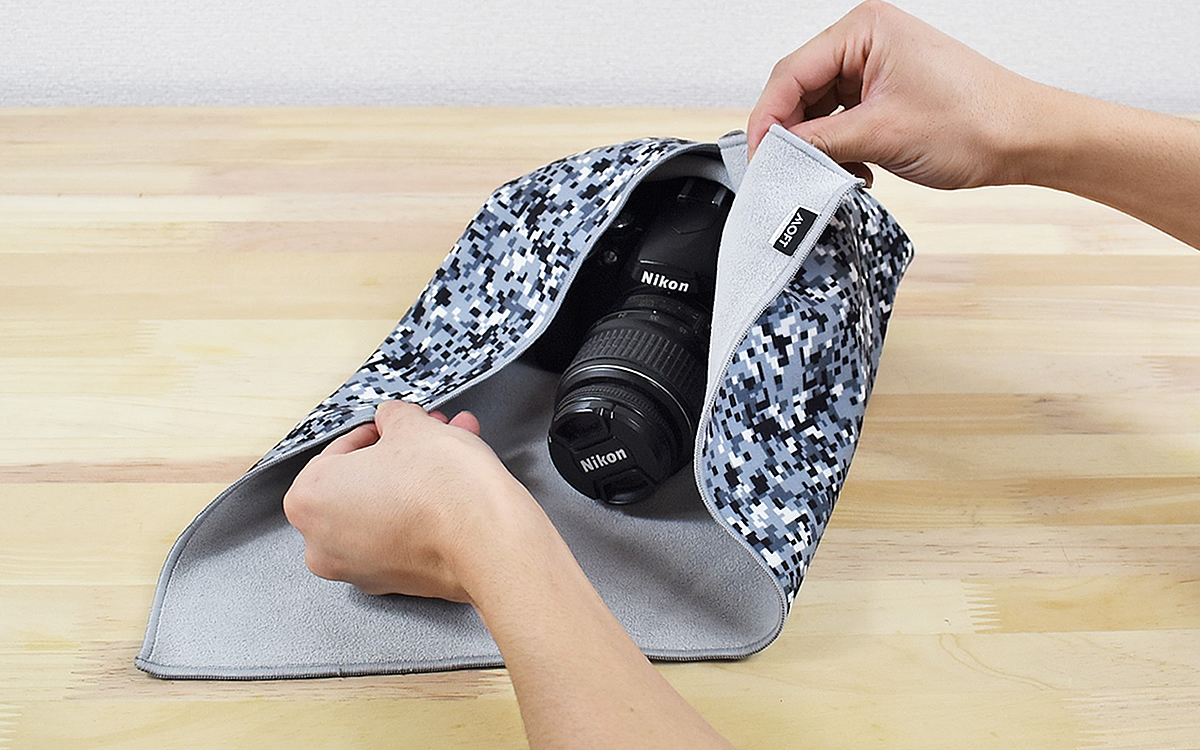 またカメラだけでなく、そのまま持ち運ぶのが不安なタブレット関係などの精密機器を包んで使うのもアリ。鞄の中で散らばらないように、複数のアイテムをまとめるのにも使えます。