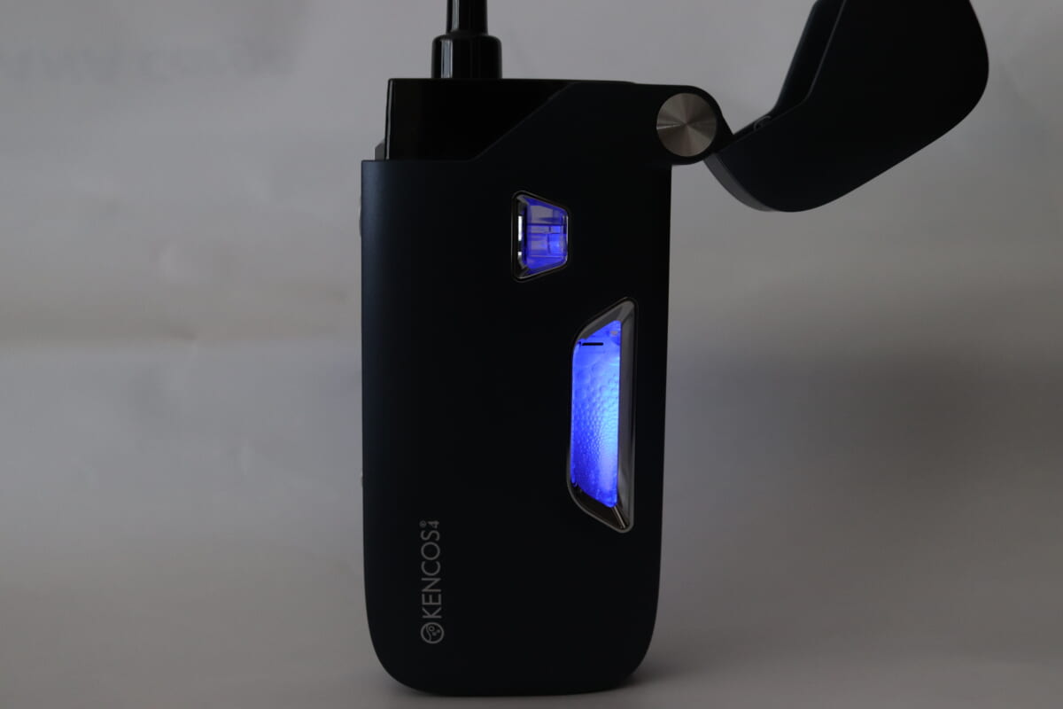 KENCOS4は加熱式たばこのような形状をした、水素を吸って吐く吸引具。早速届いたKENCOS4を箱から取り出してみると、とにかく軽い! 重量はたったの128g(電解液、カートリッジは除く)。加熱式たばこよりは大きいサイズですが、手のひらサイズでカバンのサイドポケットにすっぽり入るサイズ感です。