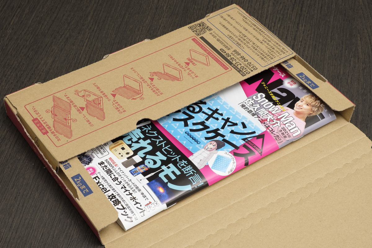 専用箱のサイズは「縦32.7cm×横22.8cm×厚さ3cm。重さは2kgまで」。……といわれても、いまいち大きさの想像ってつかないですよね。「専用箱」を買ってそのまま出品しようとしたら、厚さ3センチを超えてしまって使えなかった! とか、プチプチで梱包したら入らなくなってしまったとか。そういうことがないよう、事前にサイズ感を把握しておくことは大切です。