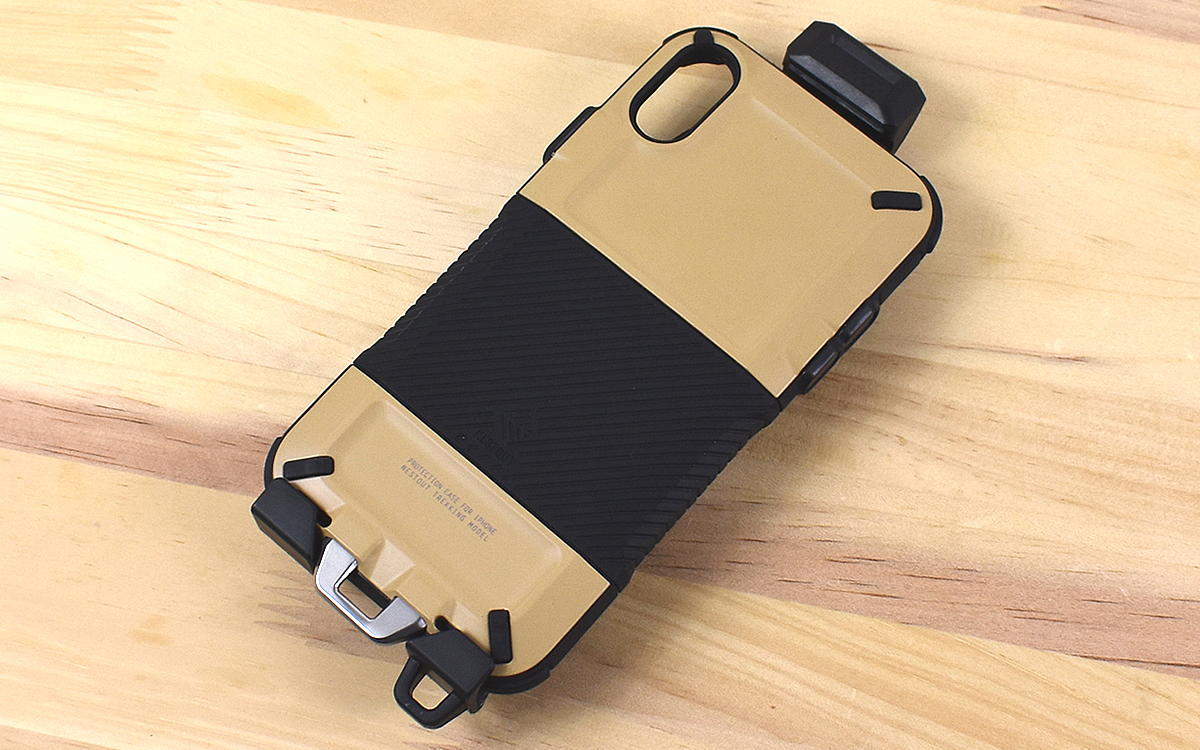 スマホカバーの方は、軽量なポリカーボネートと弾力性のあるTPUを重ねた衝撃に強い構造。落下時にダメージを受けやすい角の部分に、衝撃を吸収するエアクッションが内蔵されています。前面と背面にはわずかに飛び出た凸型のパーツがついており、本体に傷がつくのを防止。背面の黒い部分には滑りにくい凹凸のパターンが施され、操作中に手から滑り落ちる心配もありません。