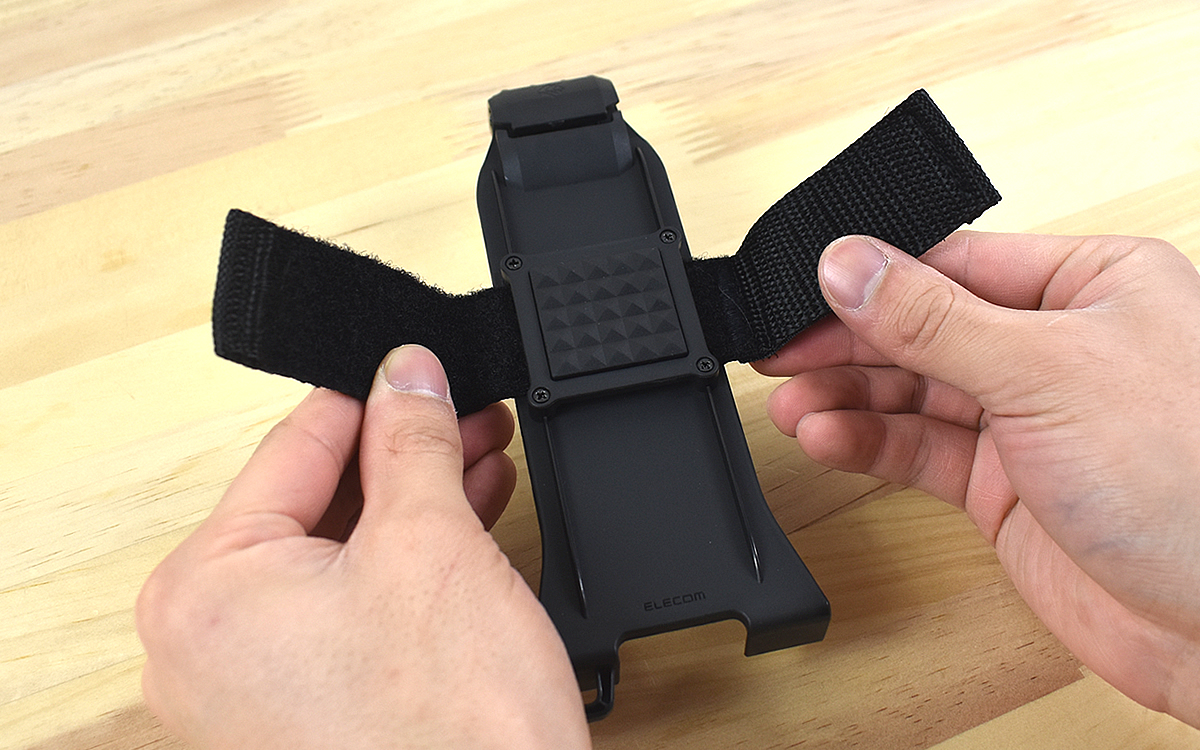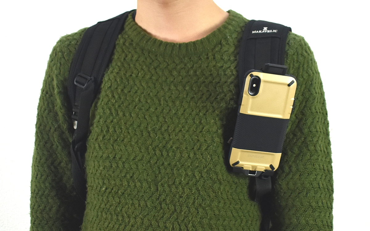さっそくスマホにカバーを装着したら、付属のベルトを使って専用ホルダーをリュックの肩紐にセット。スマホをポケットに仕舞わなくても、簡単に取り出せるようになりました。これなら写真アプリや地図アプリを使いたい時も、素早くスマホを操作できますね。