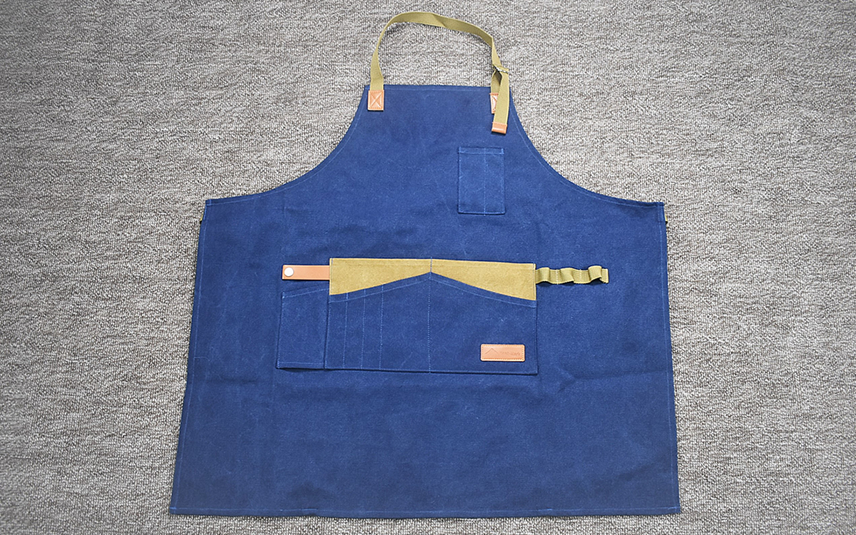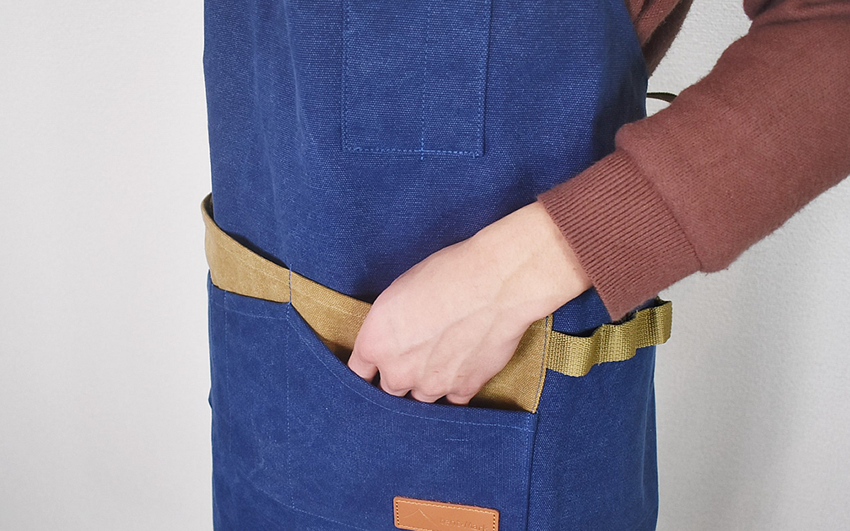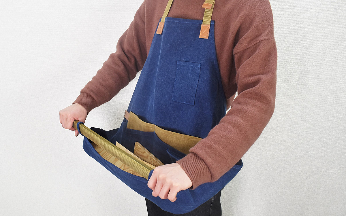さらにエプロンの裾には太めの枝を通せるループが縫いつけられていて、焚き木を運ぶログキャリーとして使うことも。キャンプだけでなくDIYやガーデニングにも役立つエプロンですよ。