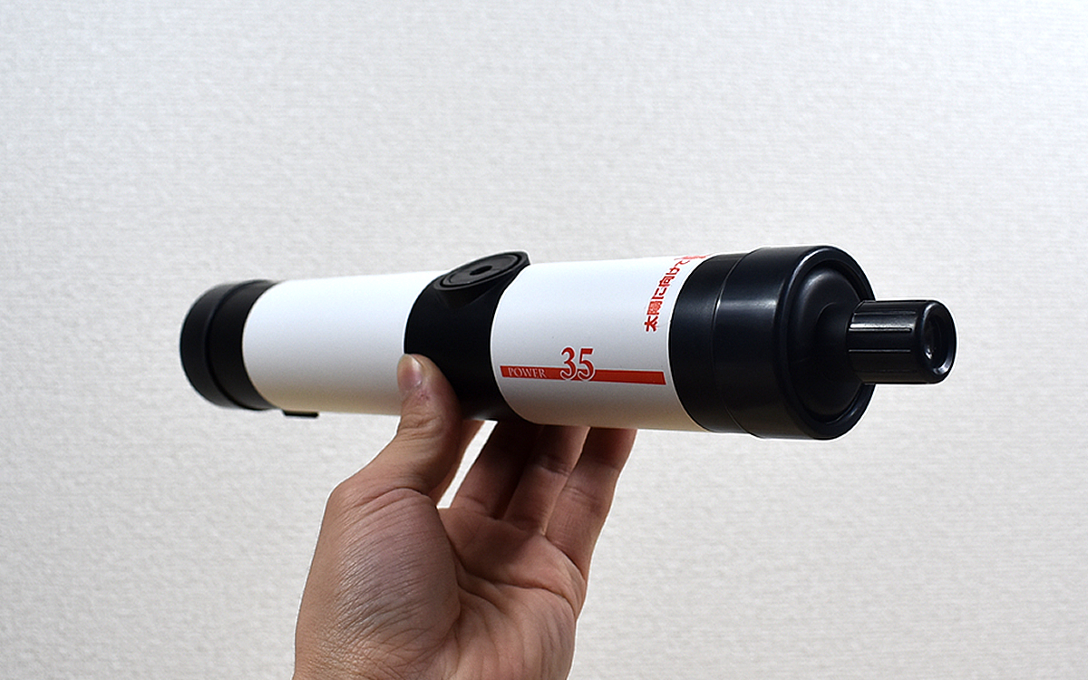 説明書を見ながら組み立てると、全長30cmほどの望遠鏡が完成。倍率は約35倍に設定されてあり、家のベランダからでも月のクレーターがしっかり確認できました。月だけでなく、木星の衛星である「ガリレオ」や土星の環も見られますよ。手持ちで観察するのが大変な場所では、市販のカメラ用三脚をスタンド代わりに使えばOK。大人から子どもまで楽しめる本格的な望遠鏡です。