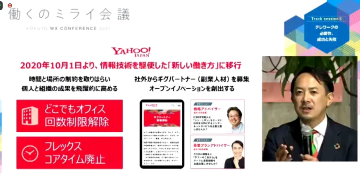 Zホールディングスの前身であるヤフーでは、2012年から月3回までの在宅勤務を認める「どこでもオフィス」というシステムを導入していたそうですが、活用実績は乏しく、なかなか利用されてこなかったとのこと。しかし、昨年のコロナ禍で一気に利用者が増えたことを受け、2020年10月より「どこでもオフィス」の回数制限を撤廃したほか、フレックスコアタイム制も廃止。さらに、社外から副業人材を公募するギグパートナー制度などを立ち上げるなど、働き方の改革に踏み切ったそうです。
