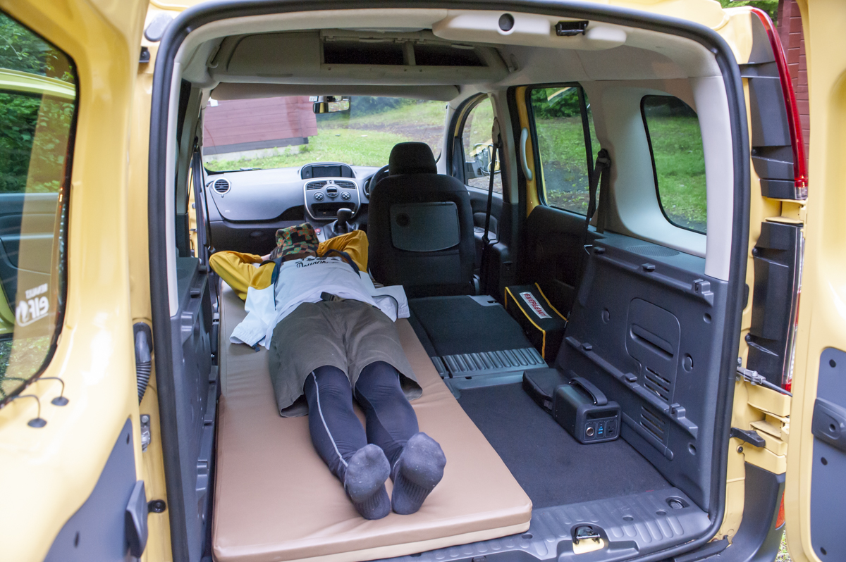 今回車中泊で使用したのは、ルノーのカングー。愛らしいデザインながら積載量や収納性はピカイチのモデルでキャンプや車中泊でも人気の一台です。後席上部には照明を付けられるフックがあり、実用性も抜群。
