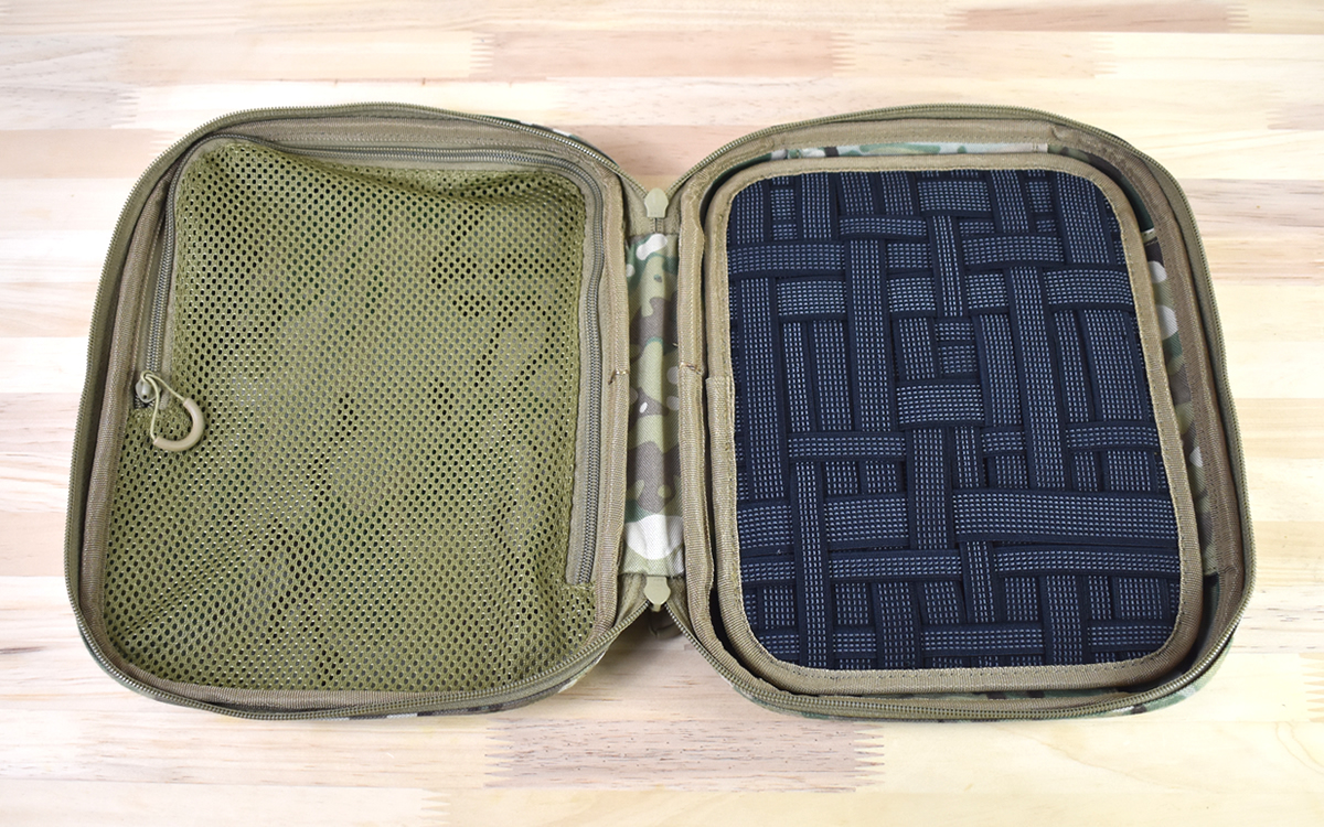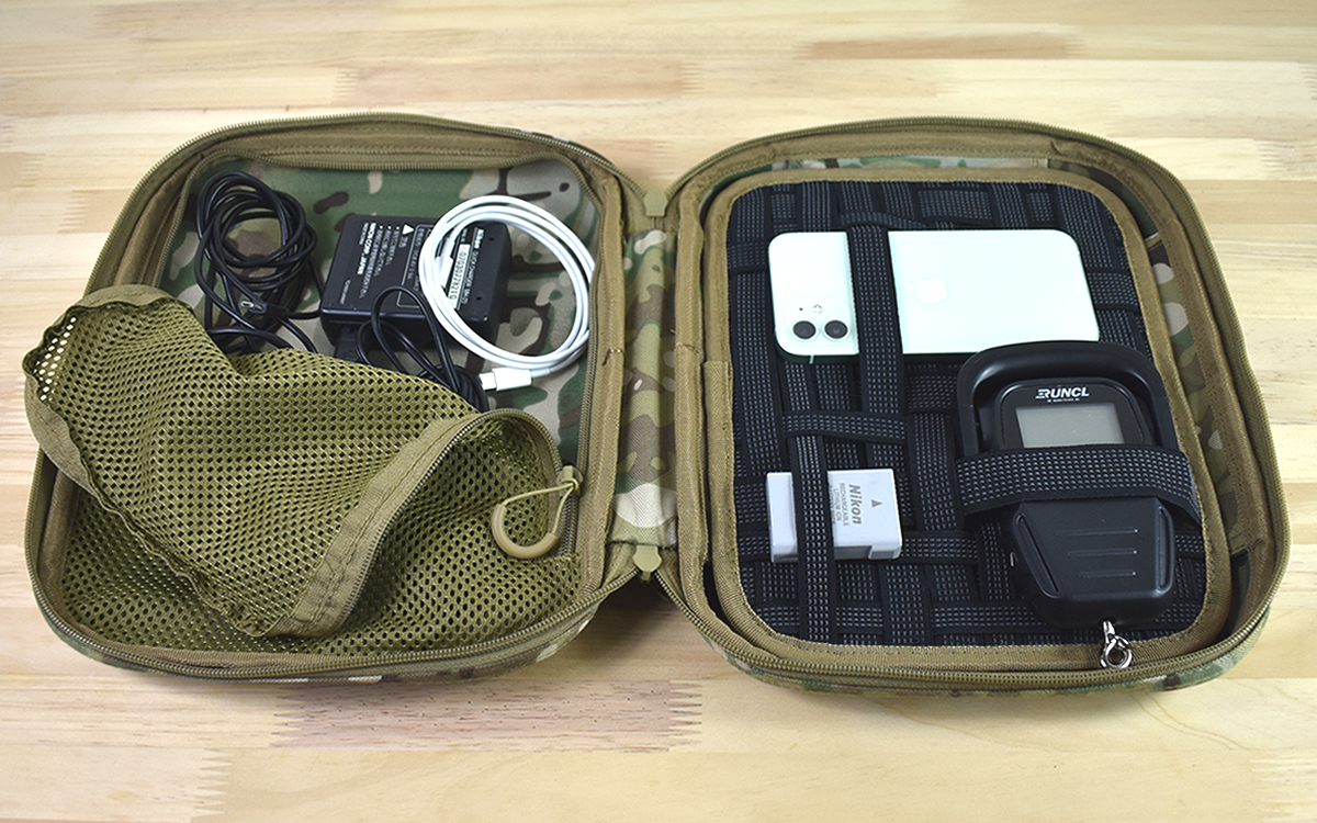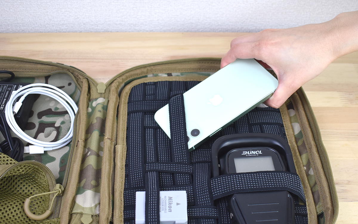 同商品を手にしてまず驚かされたのが、ケースの頑丈さ。天板・底板がセミハード仕様になっているので、安心してギアを持ち運ぶことができます。ケース内部の片側はメッシュカバーの収納スペース。まずはケーブル類から入れてみたところ、仕切りがない分、たっぷりと収納することができました。