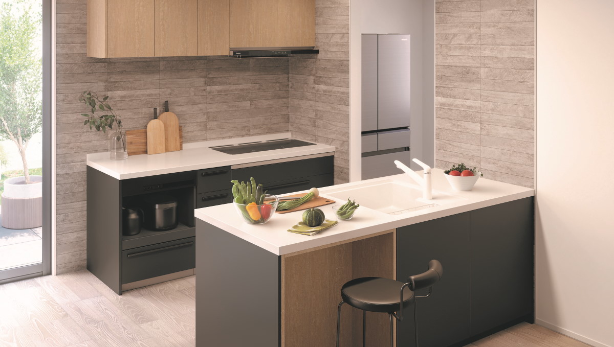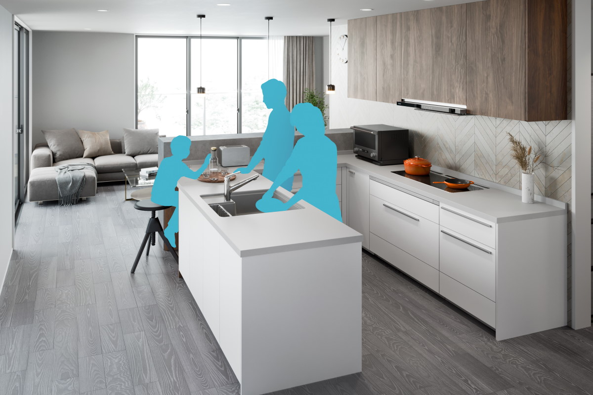 対面からも使いやすいラウンドアクセスシンクが特徴のIdobataスタイルに、複数でキッチンに立つときでも使いやすい広々としたワイドコンロシリーズが組み合わさることで、忙しい朝や親子・夫婦でゆっくり料理を楽しみたいときなど、生活の様々なシーンに対応できるキッチンとなっています。