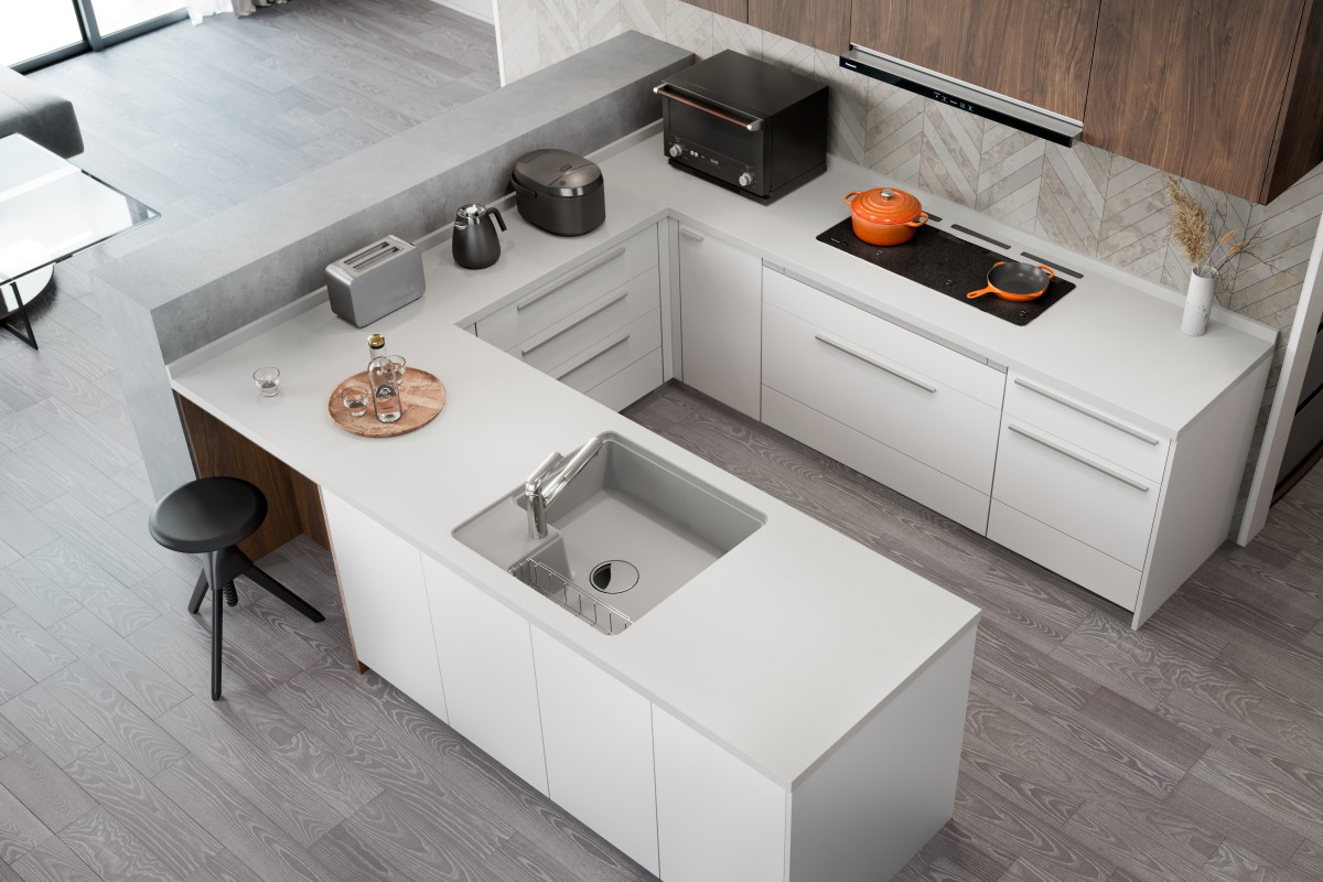 さらに、近年利用者が増えている調理家電を複数台並べて置けるカウンターを備えた「U型(コの字)プラン」も拡充。コンロ側からもシンク側からも手を伸ばしやすいレイアウトで、効率よく調理や片付けを行うことができます。