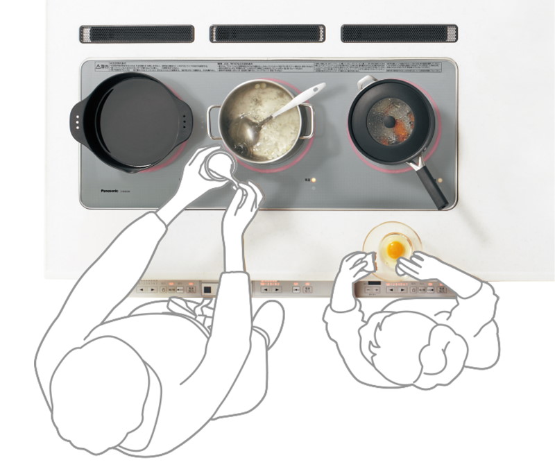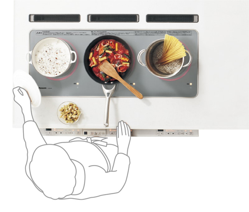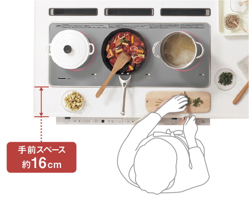 ワイドコンロシリーズは、一般的な3口コンロ(60・75cm)に比べて広々とした90cmのスペースにコンロが横並びに配置されており、一人で調理する時はもちろん、夫婦や親子で並んで一緒に調理をする場合でもほどよい距離感の幅75cmを確保できます。また、コンロ手前16cmのスペースで下ごしらえや盛り付けも可能。段差がわずか1.9mmのフラット形状でお手入れもしやすいことも特徴です。