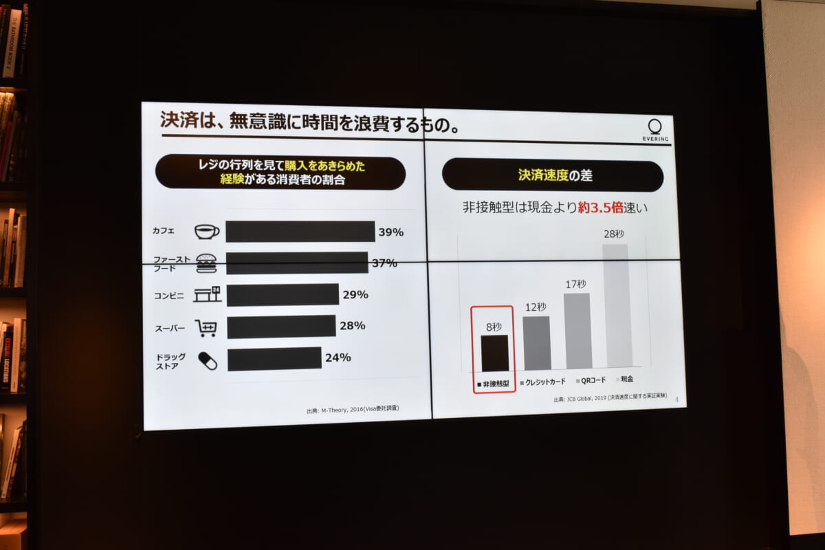 そもそも開発の背景には、「決済において無意識に消費している無駄な時間」をなくす狙いがあったとのこと。たしかに、財布からカードを取り出して暗証番号を打ち込んだり、はたまたスマホを取り出してQRコードを表示したりと、私たちはいくつもの手順を経て支払いをしています。しかも、それに慣れてしまっていますよね。場合によっては、カードの取り出しやQRコードの表示に手間取り、まさしく無駄な時間を消費していることすらあります。