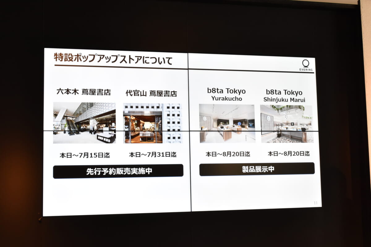 また、六本木 蔦屋書店、代官山 蔦屋書店、b8ta Tokyo – Shinjuku Marui・Yurakuchoにポップアップストアを開設。EVERINGのフィット感や決済を体験できます。さらに、六本木と代官山の蔦屋書店では、その場で先行予約が可能。先行予約した場合は夏ごろに製品が届くとのことです。