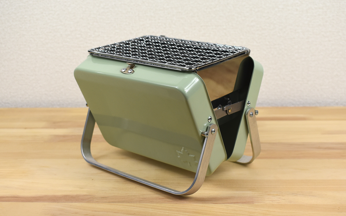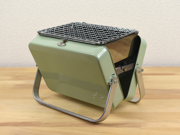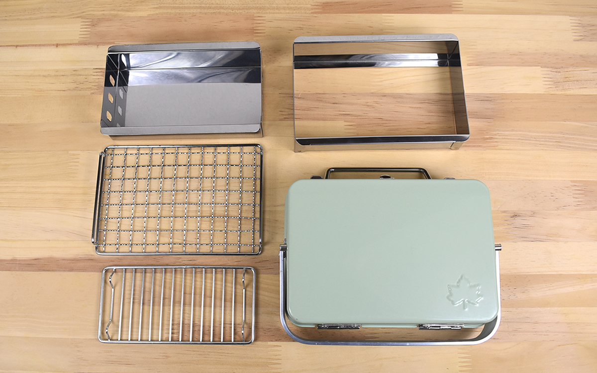 組み立ても簡単で、まずはケースの底になっている“脚”を開きます。次に留め金を外してケースをしっかり広げ、アーム部分をロック。あとはフレームをケースにはめこみ、火床・ロストル・焼網の順に重ねていけばセッティングは完了です。